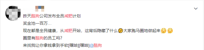 近期,酷狗的全员减肥健身计划震惊了网络,狠狠地吸了一波粉。员工每月减重5斤奖励2000块;男生练出腹肌,女生练出马甲线,奖金少1万元;还有整整100万的奖金池!没想到喜剧电影《西虹市首富》中,砸钱呼吁全员减肥的桥段居然成真了!