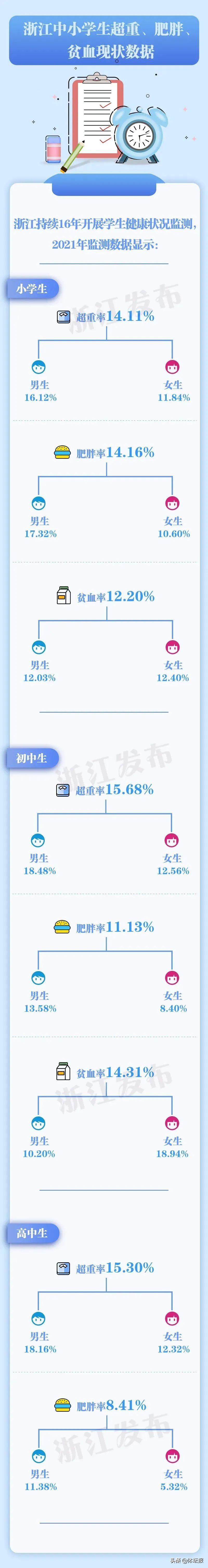 随着生活水平的提高,我们不再为温饱发愁时,越来越多的“小胖墩”出现在我们生活中。近日,浙江省疾控中心发布了2021年我省中小学生超重、肥胖现状数据:小学生超重率14.11%、肥胖率14.16%;初中生超重率15.68%、肥胖率11.13%;高中生超重率15.30%、肥胖率8.41%。