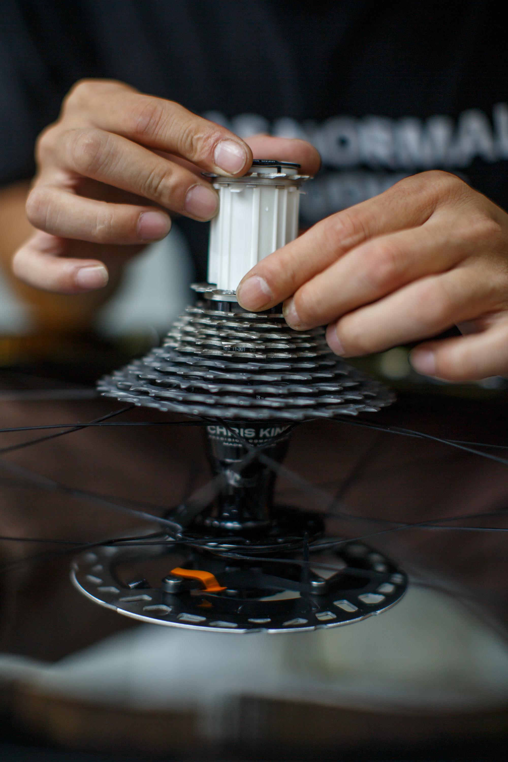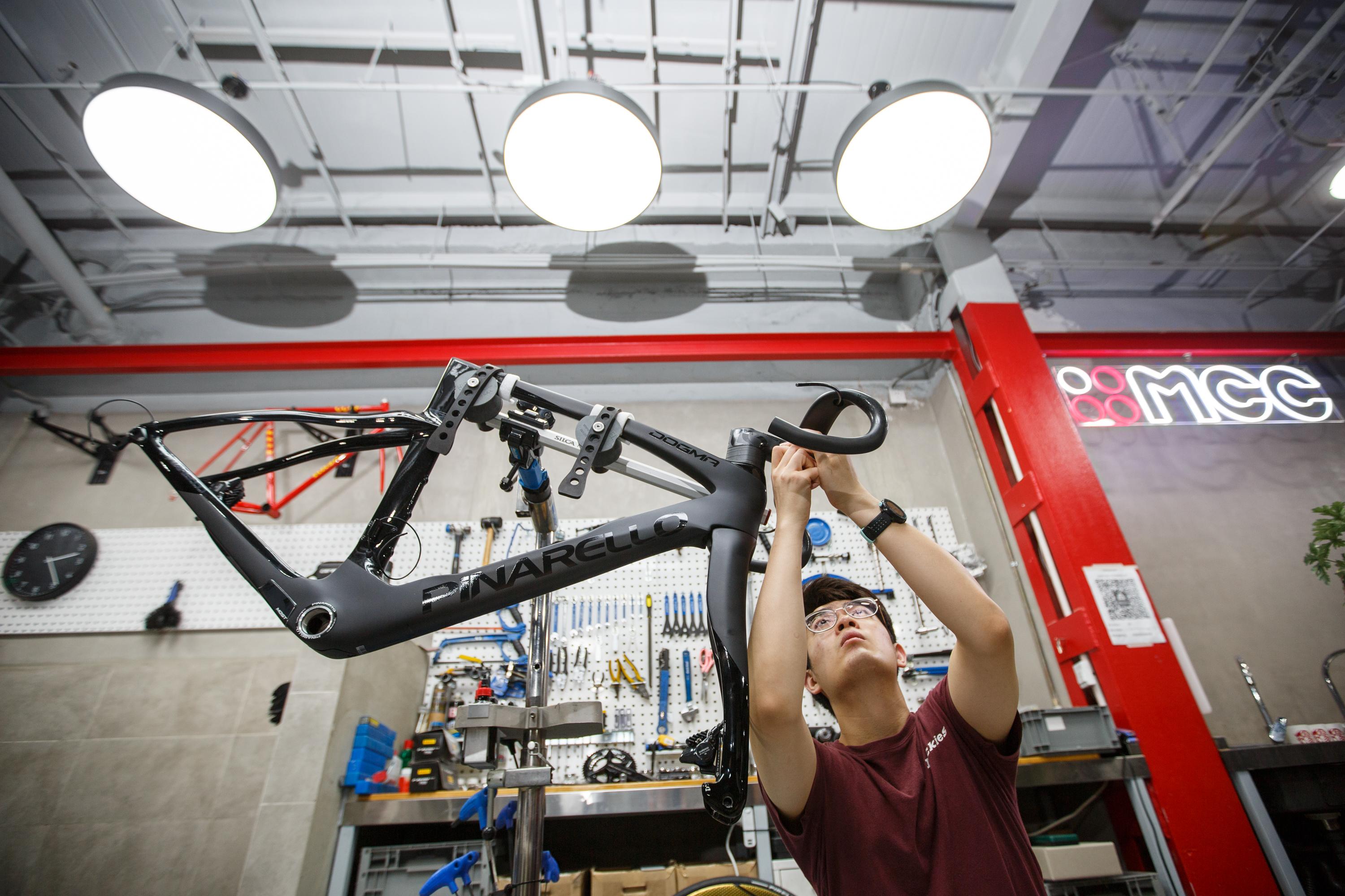 MCC车行西直门总店,机械师王俞钧正在组装一辆公路自行车。 新京报记者 王子诚 摄