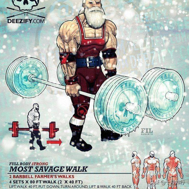 将两个杠铃分别放在身体两侧的地上,前方有足够空间行走在不弓背的情况下,下蹲抓起杠铃,然后起身直立,双臂在身体两侧自然下垂保持杠铃的平衡,尽量向前走,如果前方空间不足,可以原路返回。