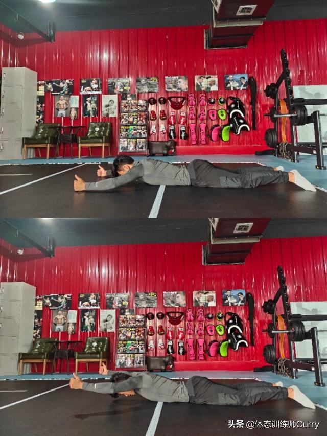 俯卧撑姿势准备,手臂保持伸直,将身体下沉,让肩胛骨和胸骨分来一些缝隙,在将身体上抬让胸骨贴紧肩胛骨,反复此动作,慢起慢落。