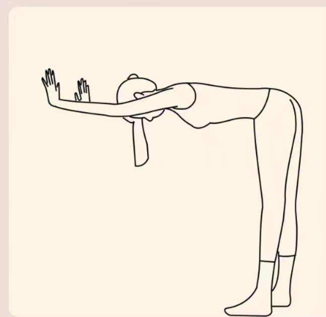 面向墙壁山式站立准备,离墙约一条腿的距离,双手伸直向上核心收紧,以髋部为折点向前向下弯曲,直到身体与地面平行,手掌撑墙,静态保持三分钟。