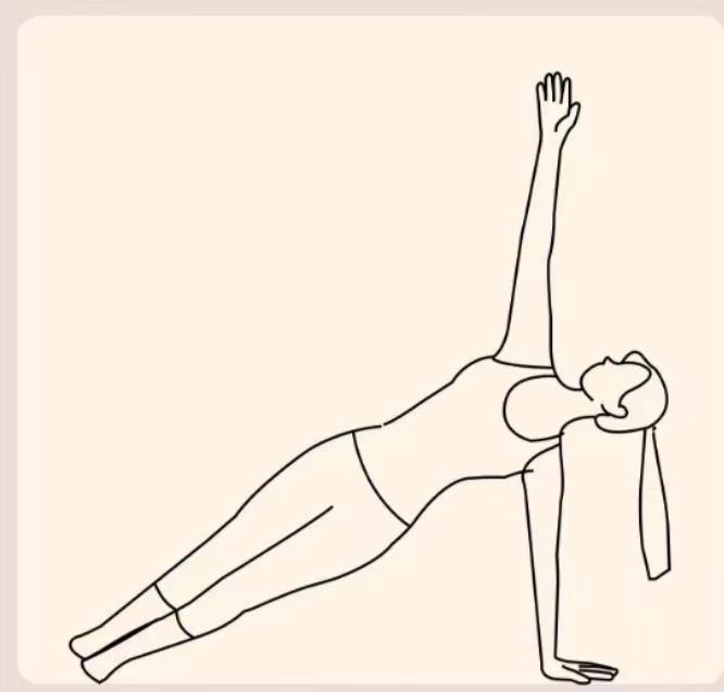 左侧卧准备,双腿伸直向下,左臂伸直撑地,臀部抬起向上,双腿并拢绷直,核心收紧,右手伸直向上,眼睛看向右手方向,单侧保持1分钟。