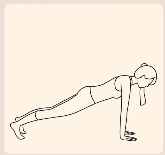 四角跪立准备,双手撑双肩下方地面,核心收紧,双腿向后伸直,脚跟向后蹬,腰背臀腿保持一条直线,静态保持1分钟。