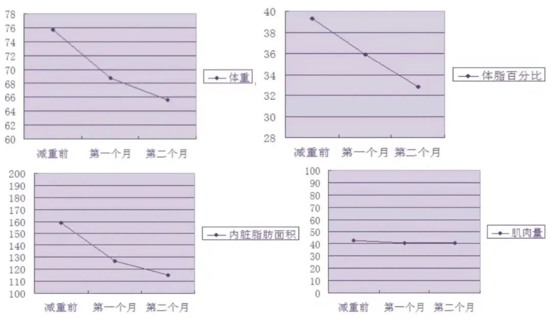 在减重2个月之后,佟女士的体重下降了20斤。仔细分析她的体成分数据分析发现,体脂肪,内脏脂肪,BMI出现了下降,而肌肉量却没有减少,实实在在做到了只减脂肪不减肌肉。