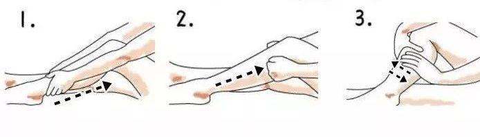 刮痧从膝盖弯根开始向下刮,每次只能刮一个方向,切忌不能来回刮!