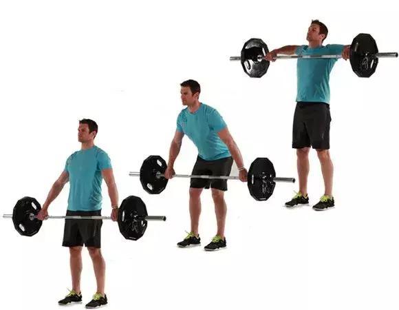 下背部形成自然拱形。当你弯曲手肘并抬起大臂时,爆发性的站起来,尽可能低把杠铃拉到高处。