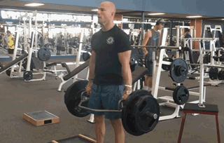 步骤2:肘部几乎完全伸直。你可能需要使用助力带,以防在重的那组动作中抓不住杠铃。这个动作不需要以较轻的重量来热身。
