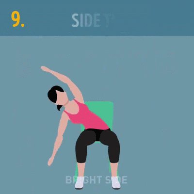 动作九:坐姿,保持下半身稳定,向两侧转动作上半身至自己大幅度。