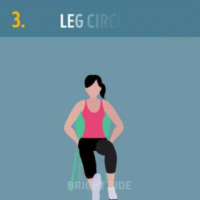 动作三:正坐,上半身挺直,双手扶住椅子辅助固定身体,抬起一条腿大幅度画圈,一条腿完成预期次数后换边。