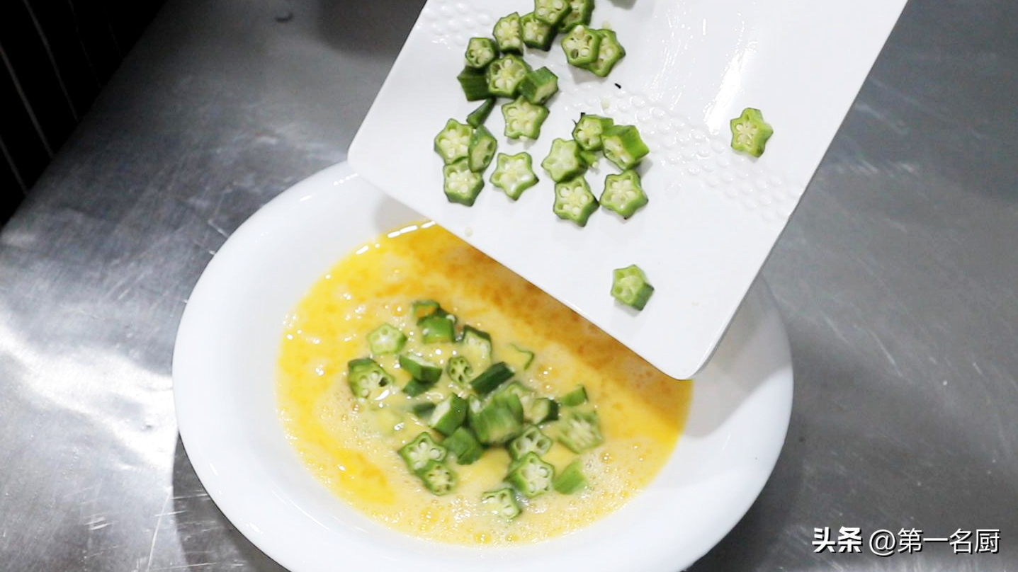 加入半勺水淀粉,再次搅拌均匀,加入淀粉可以使蒸出来的鸡蛋更加滑嫩,然后把秋葵倒入鸡蛋液里面备用。