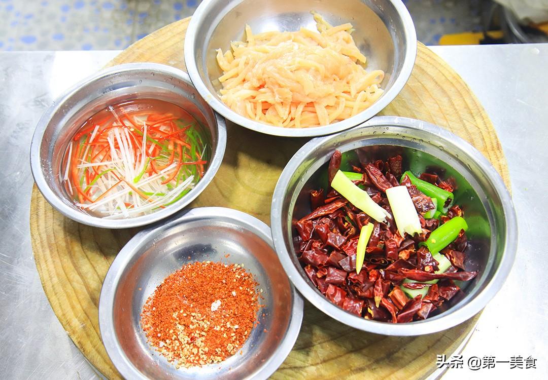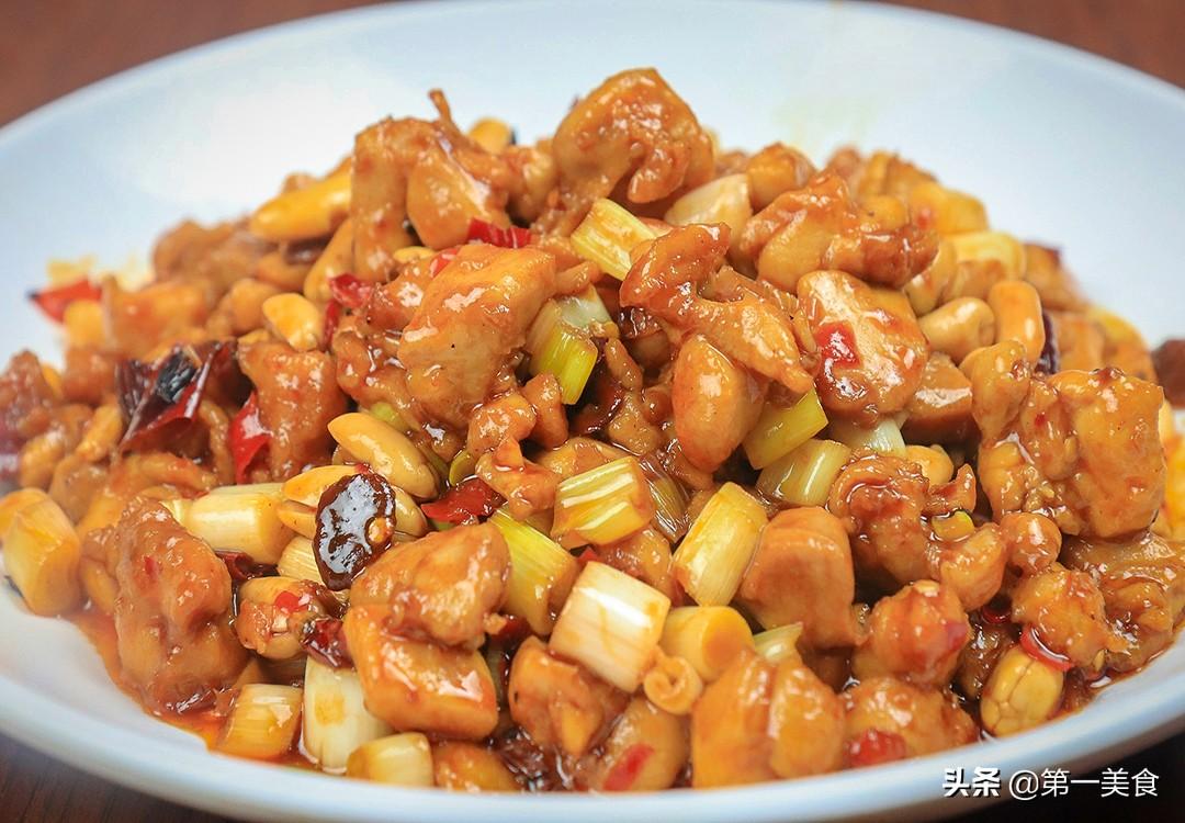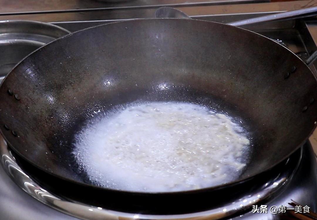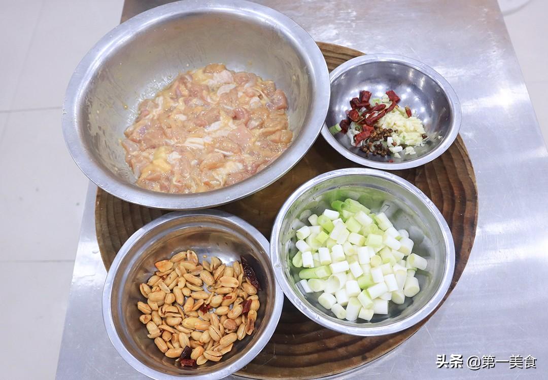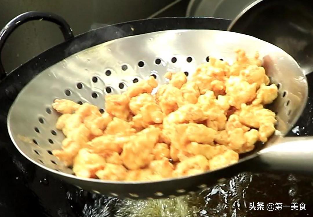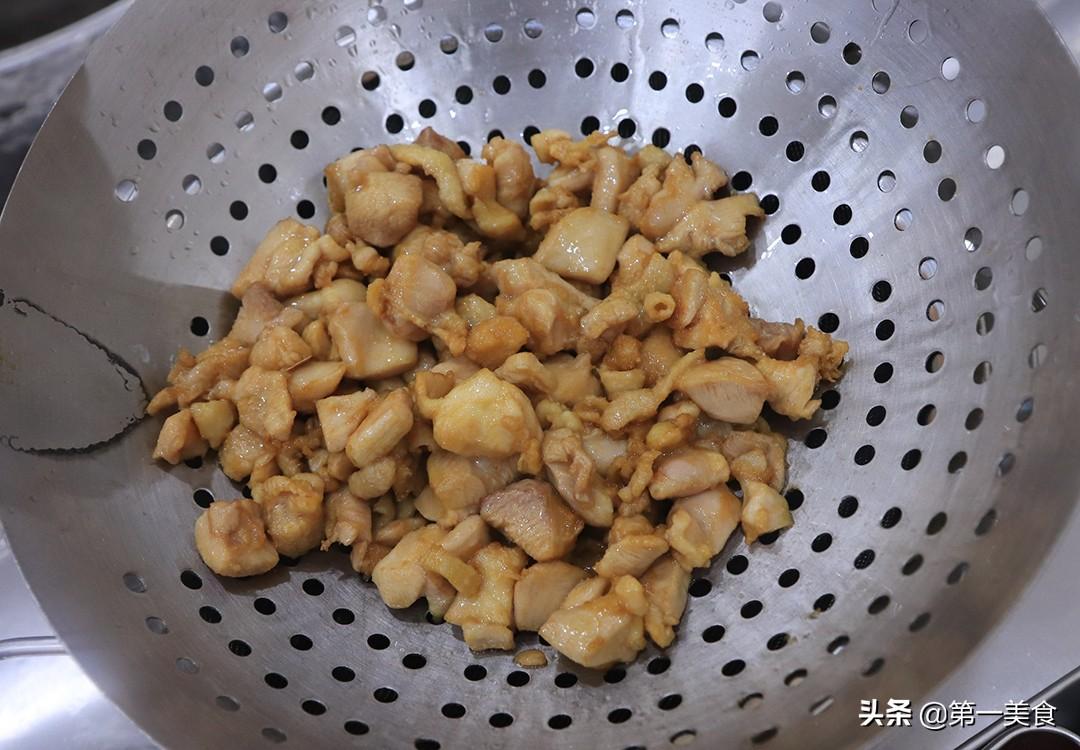 锅内烧油,油温五成热,油面轻微冒烟时起锅,把鸡丁一个一个放入锅中,避免粘在一起,这一步的目的是防止前后下入的鸡丁色泽和生熟不一,鸡丁下完以后把锅放在火上,保持小火,大约炸制3分钟,炸出鸡丁中的水分,鸡丁定型以后捞出。