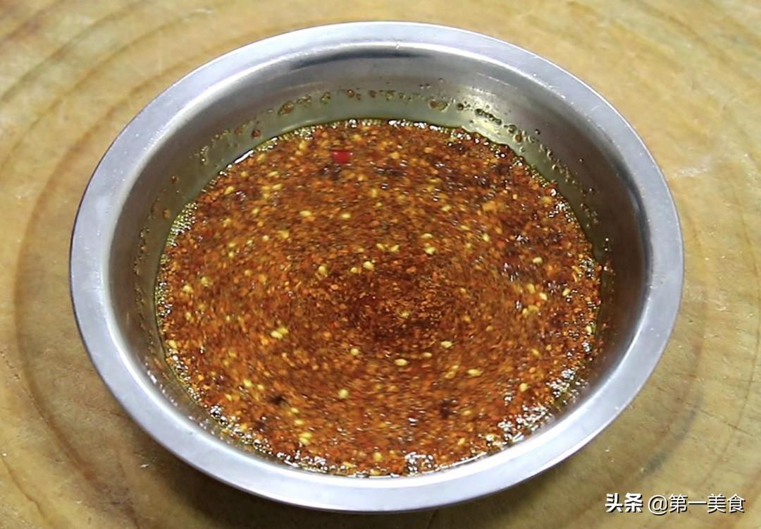 把炸好的花椒油,倒在刚才准备好的辣椒粉上,激发出辣椒粉的香味,用筷子快速搅动,让辣椒粉均匀受热。