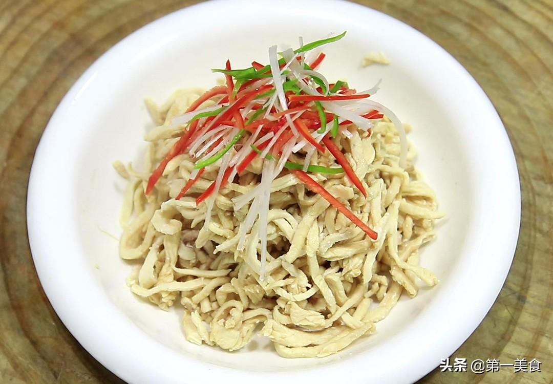 锅内烧水,把鸡丝放入锅中,加入食盐2克,料酒5克,淋入几滴老抽提色,把鸡丝焯水至断生以后捞出,用清水冲洗掉鸡丝上面的浮沫,把鸡丝放在盘中,上面摆放好青红椒丝配色。