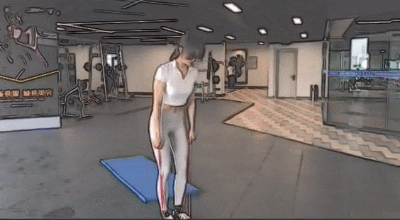 2.双脚自然开立,左脚向后撤,呈弓箭步状,吸气,双手向上拉绳,左膝尽量不要触地,至极限后呼气,回到初始位置。