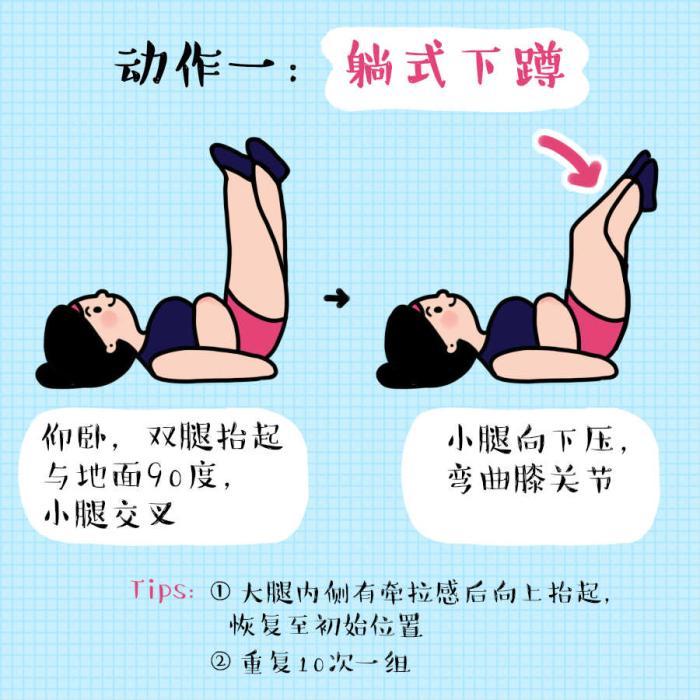 仰卧,抬起双腿,与地面90度,小腿交叉。同时小腿向下压,弯曲膝关节,感觉大腿内侧有牵拉感后向上抬起恢复至初始位置。重复十次一组。