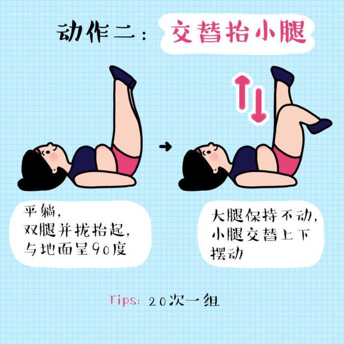 平躺,双腿并拢抬起,与地面呈90度。大腿保持不动,小腿交替上下摆动。当小腿抬至高点时,绷紧肌肉,脚趾朝外。20次一组。