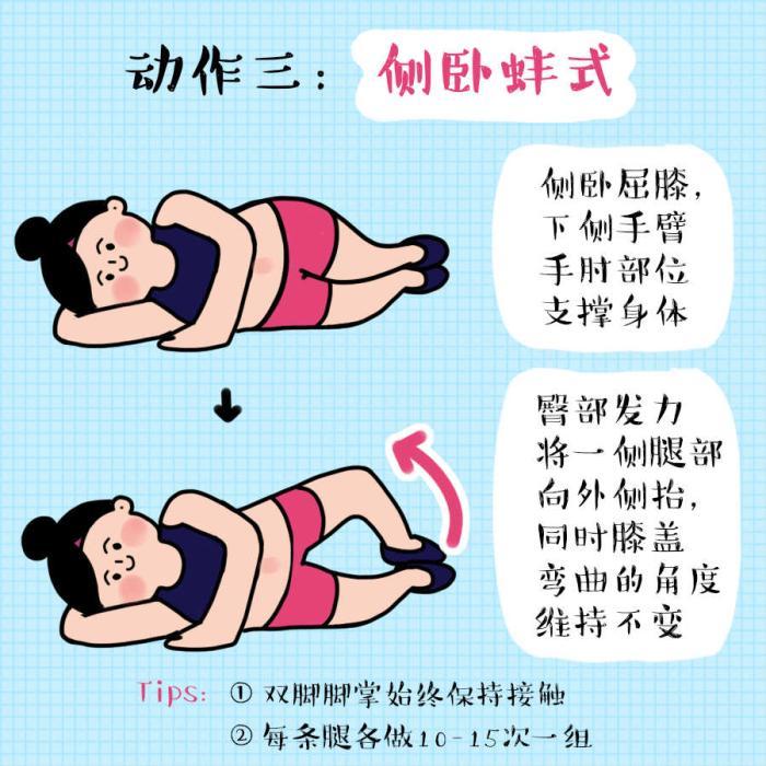 侧卧屈膝,下侧手臂手肘部位支撑身体。收紧腹部保持身体核心稳定不晃动,肩膀和髋骨与地面成垂直线;臀部发力将一侧腿部向外侧抬,同时膝盖弯曲的角度维持不变,双脚脚掌始终保持接触。每条腿各做10-15次一组。