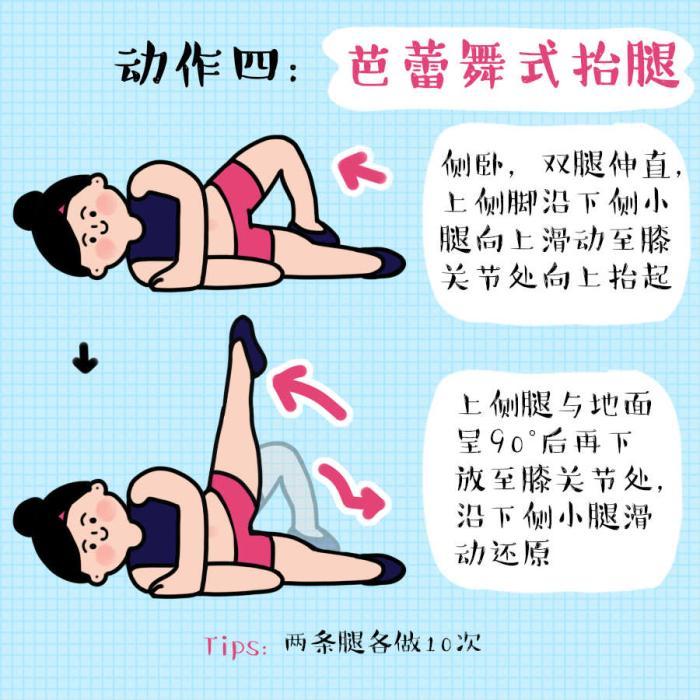 侧卧,双腿伸直,上侧脚沿下侧小腿向上滑动至膝关节处向上抬起,到达顶端(与地面呈90°)后再下放至膝关节处,沿下侧小腿滑动还原,换边进行。两条腿各做10次。