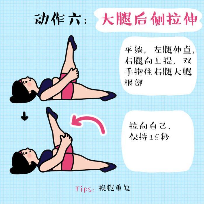 平躺,左腿伸直,右腿向上提,双手抱住右腿大腿根部,拉向自己,保持15秒。换另一条腿继续上述动作。