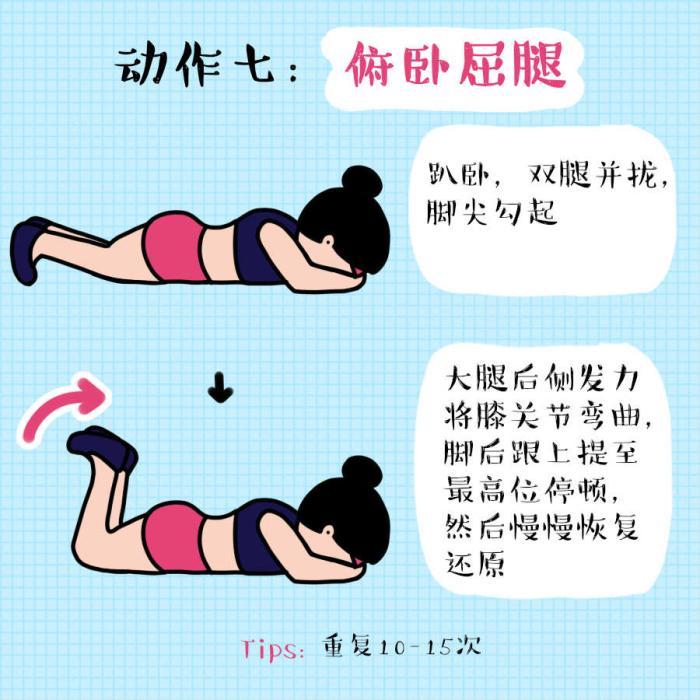 趴卧,双腿并拢,脚尖勾起,大腿后侧发力将膝关节弯曲,脚后跟上提,直至高位停顿,然后慢慢回复还原,重复10-15次。