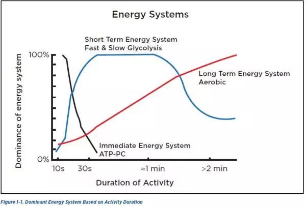 下面这张图描述了运动时长与三个供能系统的关系: