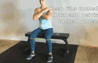 坐于平板凳一端,核心收紧,腰背挺直,弹力带放于膝盖位置