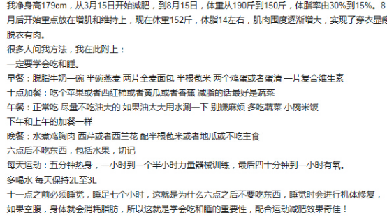先贴上面那位哥们的运动和饮食清单——