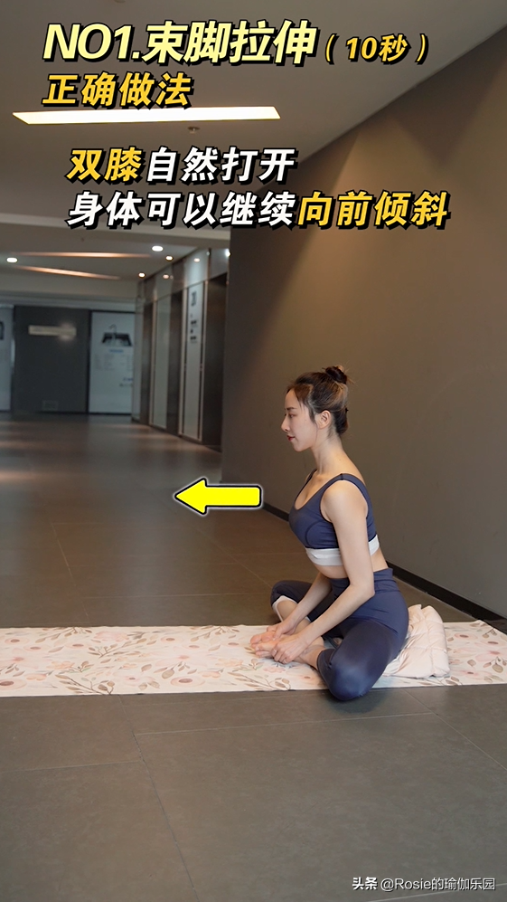 2)再随呼气,右腿向下打开,感觉大腿内侧充分拉伸。坚持5秒。