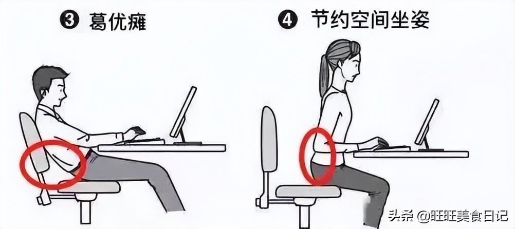 和骨盆前倾相对于的就是骨盆后倾,也就是骨盆发生了一个向后倾斜的角度,大多情况是由这两种坐姿导致的。