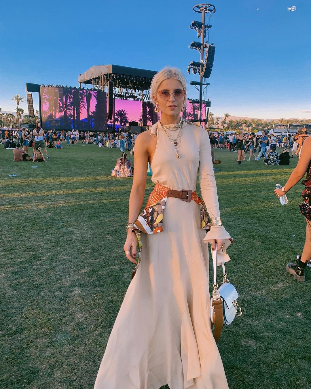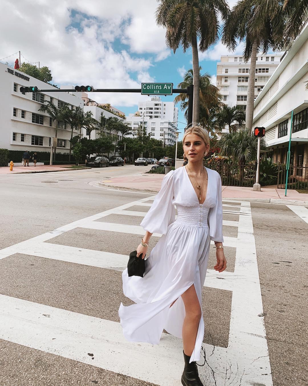 裙身开叉的设计可以将纤细的腿型展现出来,Caroline Daur还利用了项链等配饰来点缀整体的视觉果,也更有时尚感。