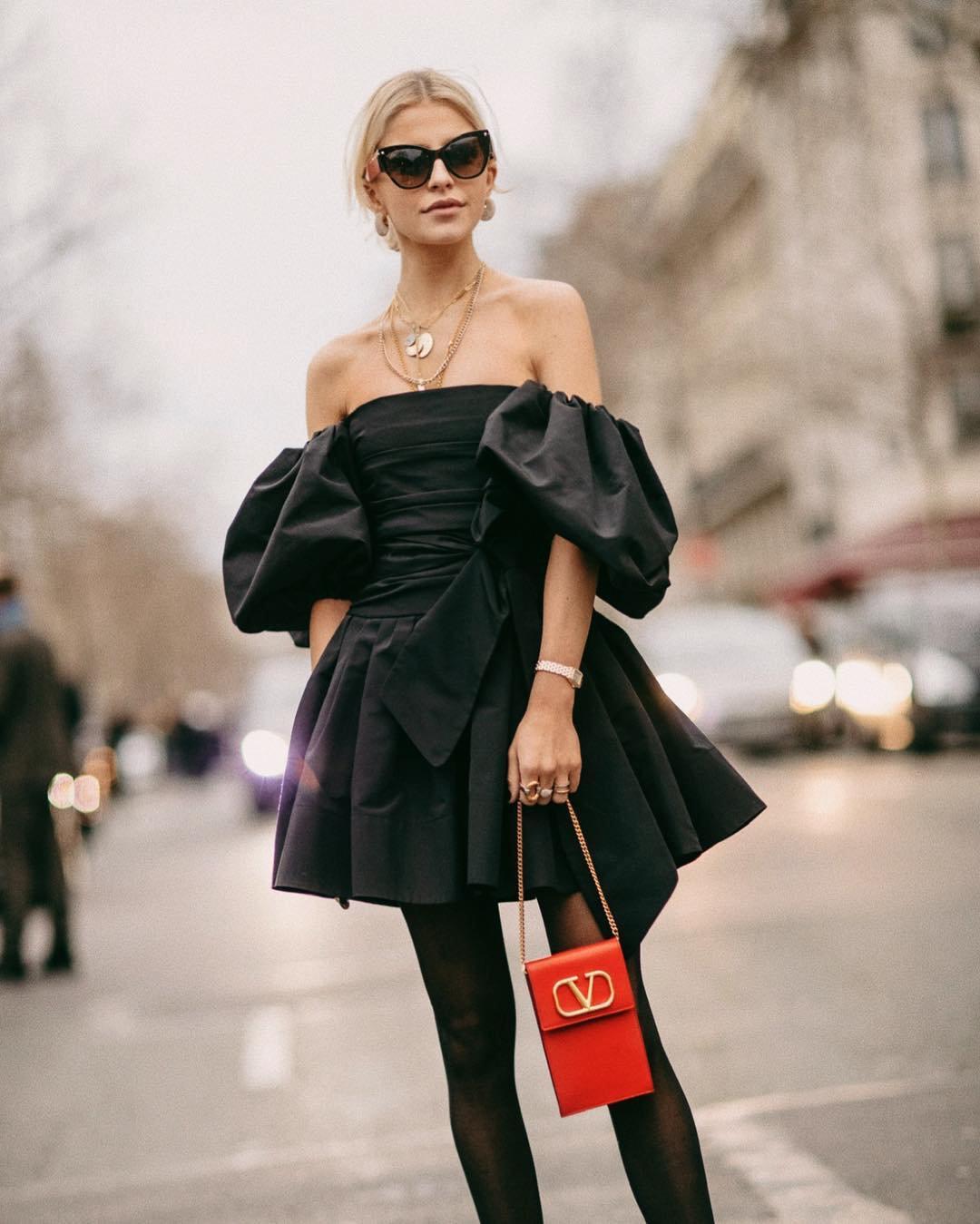 泡泡袖的设计和蝴蝶结的系带增加了整体搭配的活泼俏皮感,红色的小挎包打破黑色系的沉闷,在色调上起到调和的作用。