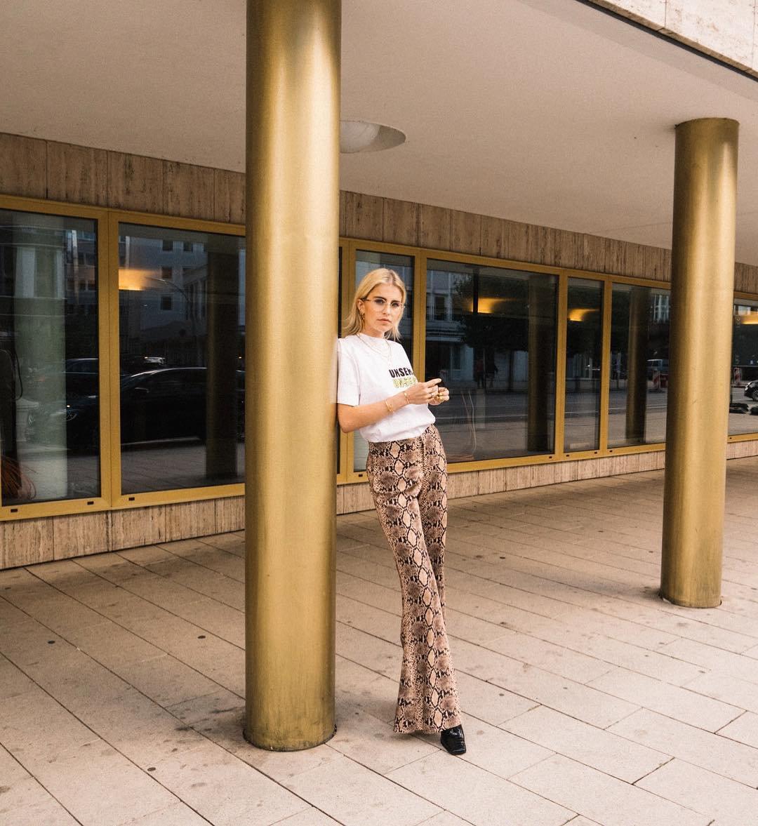 白色的短袖搭配靛青色花纹的衬衣和银色裤子,裤子的质地和衬衣的花纹都的时尚,看起来帅气十足,Caroline Daur还是选择了将衬衣掖在裤子里来修饰身型。