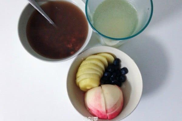 刘雯晚餐的份量比较少,红豆汤和薏仁水有去水肿的作用,还有美白的果。水果则有蓝莓、桃子及奇异果,都有抗氧化作用,能够养颜美容。