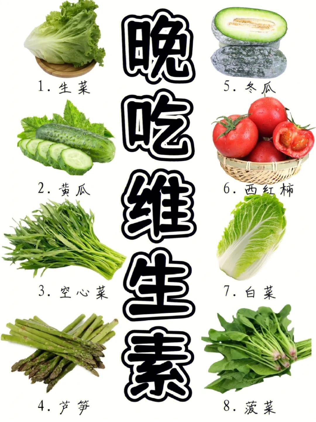 晚餐吃维生素:西红柿、黄瓜、白菜、花菜、黄瓜、苦瓜、西兰花、芹菜、秋葵...注意/