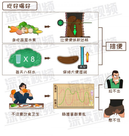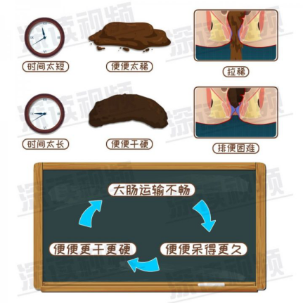 运输不畅又会使便便待得更久,变得更干更硬,这样恶性循环,就搞出了便秘。