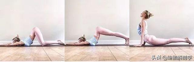 跪立在垫面上,双膝双脚打开与髋同宽小腿脚背贴地,身体向前俯卧在垫面上双手臂向前伸直,下颌点地,保持2-3分钟慢慢的依次伸直双腿,较后跟向后蹬大腿肌肉伸直,臀部向上,保持2-3分钟慢慢的屈双膝,双手放在胸腔的两侧身体向前向上穿越,来到上犬式伸直手臂,大腿收紧,注意不要折腰胸腔打开向前向上延展,保持2-3分钟