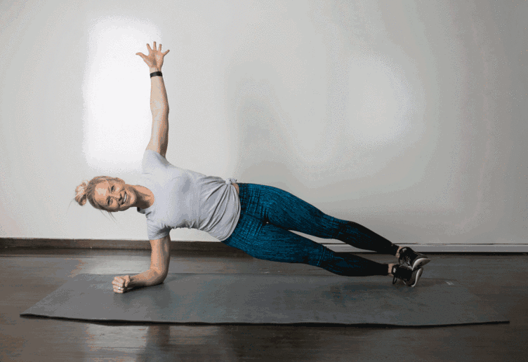 首先,要把身体放在垫子上,用右手的力量支撑身体,把肩膀、背部和臀部放在一条直线上,保持收紧核心的状态。在这个动作上,要保持腹部式呼吸,感受腹肌的发力感,使身体下沉和抬起,这个动作连续20个,完成后休息15秒,完成3个组。在运动过程中要一直处于紧绷的状态,不能弯曲身体,不能用嘴呼吸,尽量用鼻子呼吸否则就感受不到肌肉的发力感。