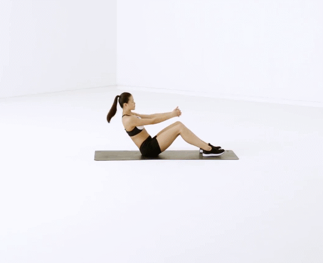 这是经典的练习腰部腹肌肉的动作,可以有帮助我们瘦瘦的肚子。这个动作将比上面的动作更困难。做这个动作的时候,上半身伸直,双手手掌相对合十向前伸展,让身体坐在地上,身体向后倾斜,身体和地面有夹角,不要完全贴在地面上,双脚贴在地面上就可以了,身体要左右旋转。要想绷紧身体的肌肉,一次要做45秒,一天要做3组。