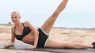 二、侧向抬腿,两边重复做,有利于改良大腿内侧赘肉。