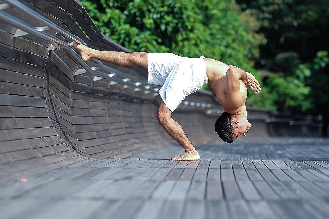 2.另一侧的手臂朝向空中伸展,尽量的与地面保持着稳定性。