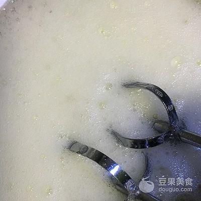 6、蛋白放入无油无水的打蛋盆,无油无水很关键,不然会影响打发。加入几滴白醋或者柠檬汁,增加蛋白的稳定性,也可以起到去腥的作用。打蛋器低速打发,打出较粗的泡泡,加入三分之一白糖。