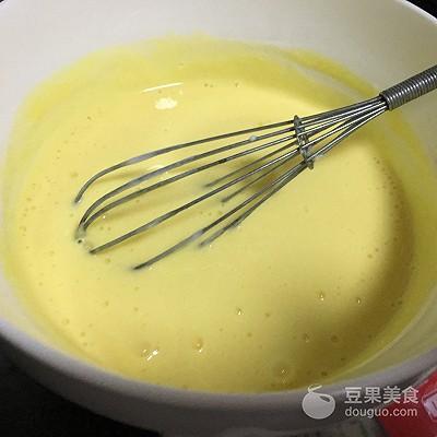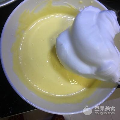 9、1/3蛋白加入蛋黄糊,用铲子上下翻拌均匀,不要打圈防止蛋白消泡。再加入1/3继续翻拌。