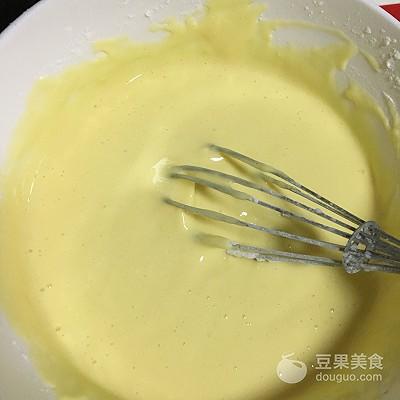 10、把蛋黄糊全部倒入蛋白中,翻拌均匀。