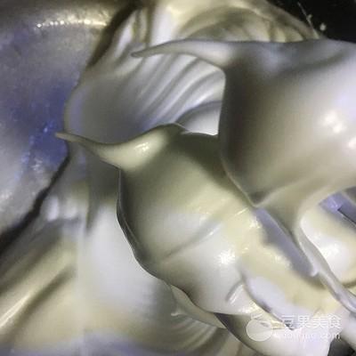 7、调中速继续打发,变成细腻泡沫,加入三分之一白糖,调高速继续打发,泡沫出现纹路,倒入剩余的白糖,继续打发,打至硬性发泡。