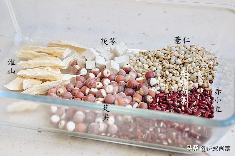 材料:赤小豆50克,薏米50克,芡实50克,淮山20克,茯苓15克。