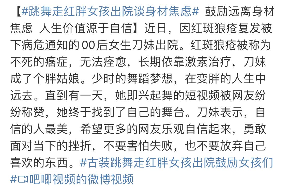 几乎同时看到的另外一条新闻,是一个胖女孩的采访,她曾经因为生病吃激素而肥胖,后来发跳舞视频在网上走红。对于“身材焦虑”,这个曾经路经鬼门关的女孩说,大概更有说服力。