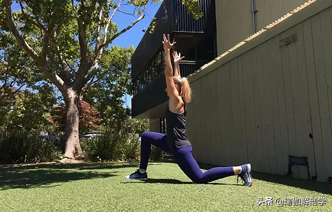 下犬式撤左腿向后一大步左膝贴地,右小腿垂直垫面双手上举,脊柱延展向上髋部向下沉降,胸腔打开保持5-8个呼吸3、高弓步
