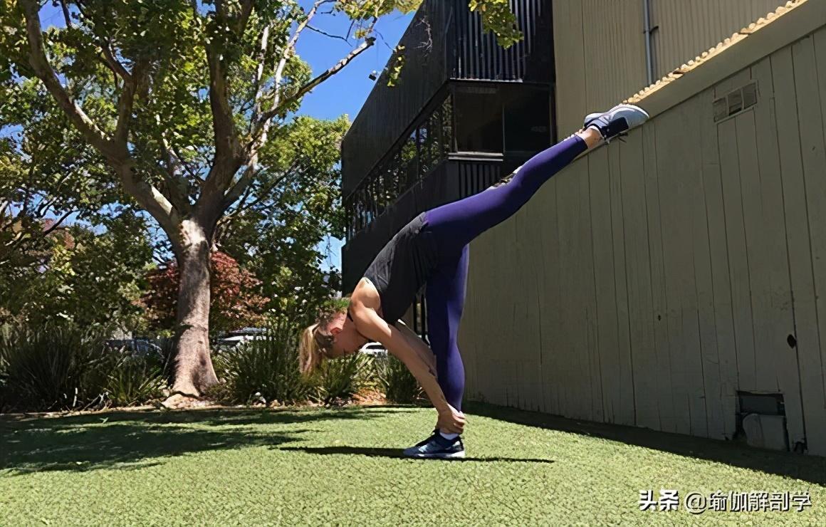 高弓步进入,上半身前屈向下左手在右脚内侧撑地转胸腔朝右,伸直右手臂向上左腿伸直,保持5-8个呼吸5、战士三式
