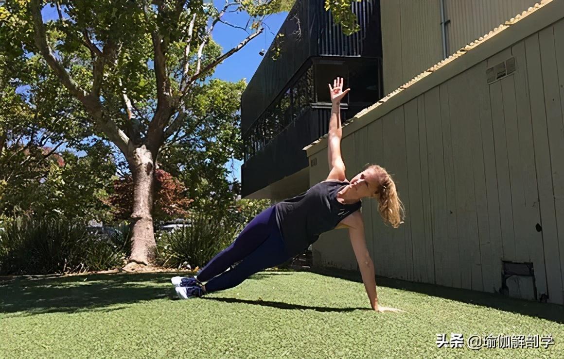 斜板式进入,抬左腿向上左腿与髋同高,伸直左手臂向前右手和左腿向两端延长核心收紧,脖颈放松保持5-8个呼吸,换另一侧11、侧板式